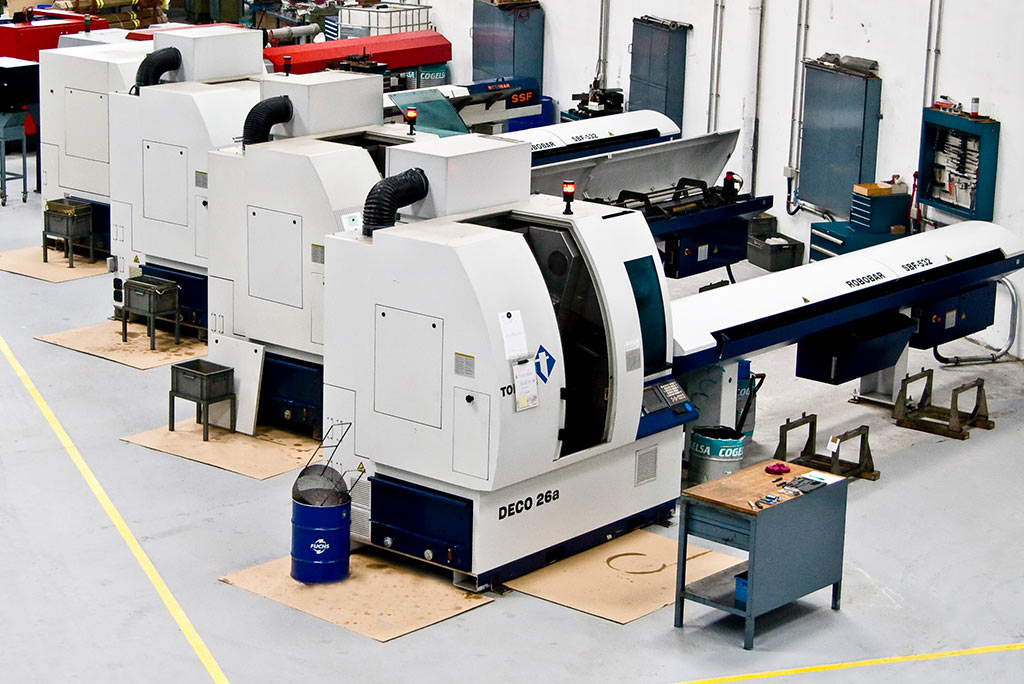 En la primera d’elles es treballa amb torns de control numèric (C.N.C) tant de capçal fixe com de capçal mòbil, en la segona es treballa amb torns tipus revòlver neumàtics i automàtics de lleves automàtics (de lleves i capçal mòbil automàtics). Per altra banda repartides entre les àrees de producció tenim diverses màquines de segones operacions.